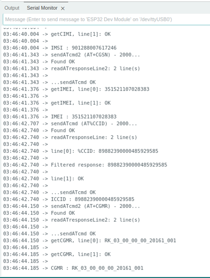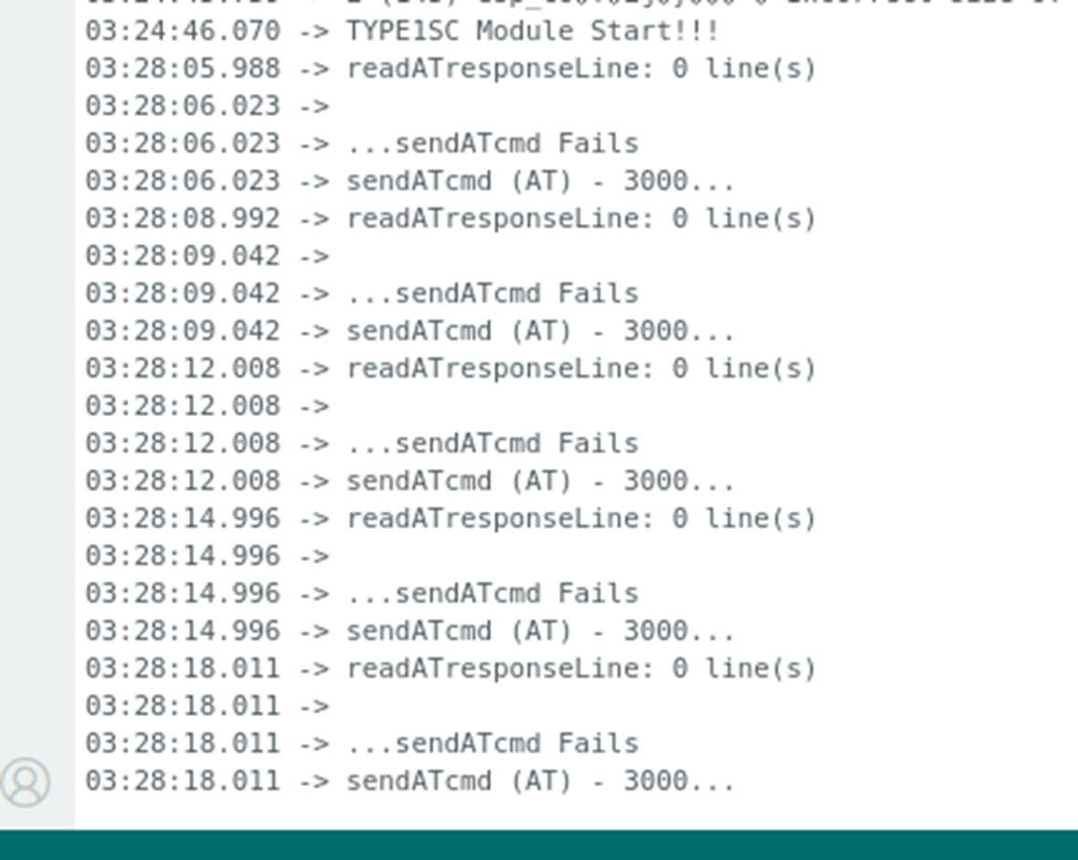 메시지를 보면 ESP IoT 보드에서 LTE CATM1 모뎀으로 AT라는 문자를 보냈는데, 3초 타임아웃까지 아무런 메시지를 받지 못해서 계속 반복하고 있는 상황이었습니다. (모뎀과 통신이 되는지 확인하는 과정이라 응답을 받지 못하면 계속 반복하도록 라이브러리에 구현되어 있습니다.)