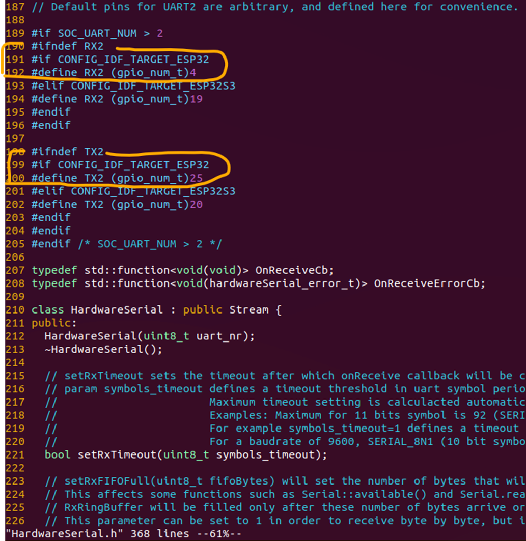 ESP32 IoT 보드와 LTE CATM1 모뎀이 Serial2로 통신하고 있는데, 관련된 구현에 뭔가 바뀐 것이 있을 것 같다는 의심이 들었습니다. 업데이트한 Arduino esp32 패키지를 조사해 보았습니다. 운영체제에 따라 패키지가 설치되는 위치의 차이가 있습니다. 제가 사용하는 우분투 리눅스에서는 아래 경로의 파일입니다.