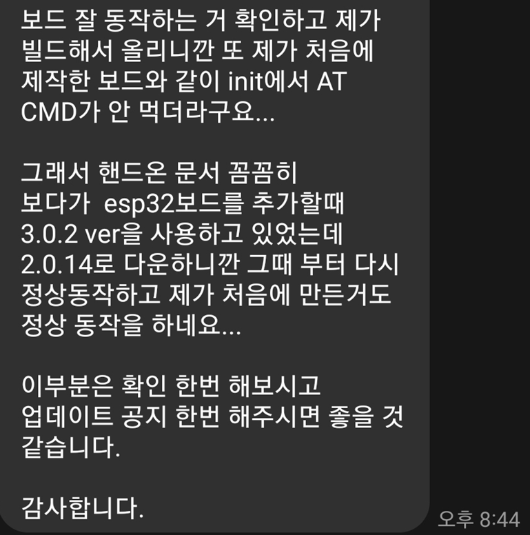 최근에 ESP32보드에 Arduino 모뎀 라이브러리를 올렸을 때 보드에서 모뎀 스타트 메시지 이후 동작 안된다는 연락을 몇 분에게 받았던 터라 어떤 문제인지 코드 분석을 시작했습니다.