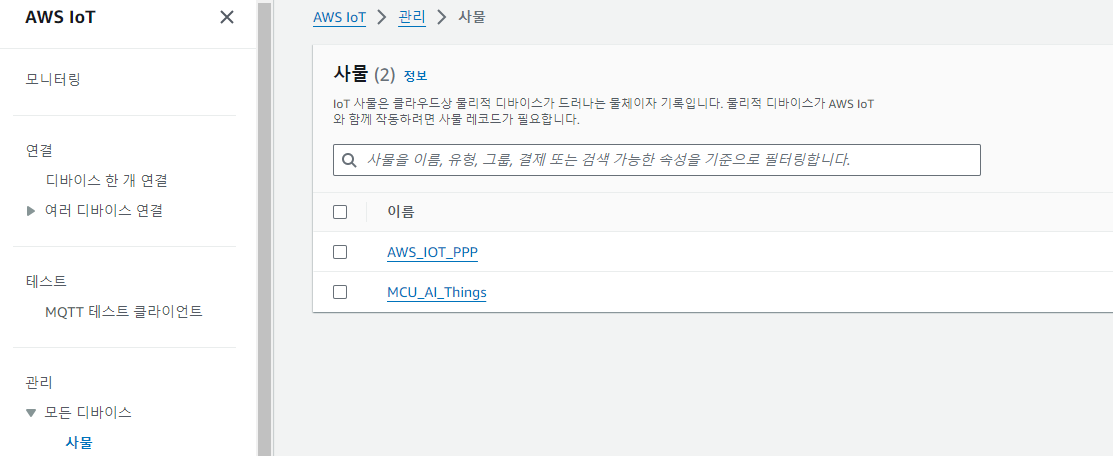 AWS_IOT_PPP, MCU_AI_Things 두개의 사물을 만들었습니다.