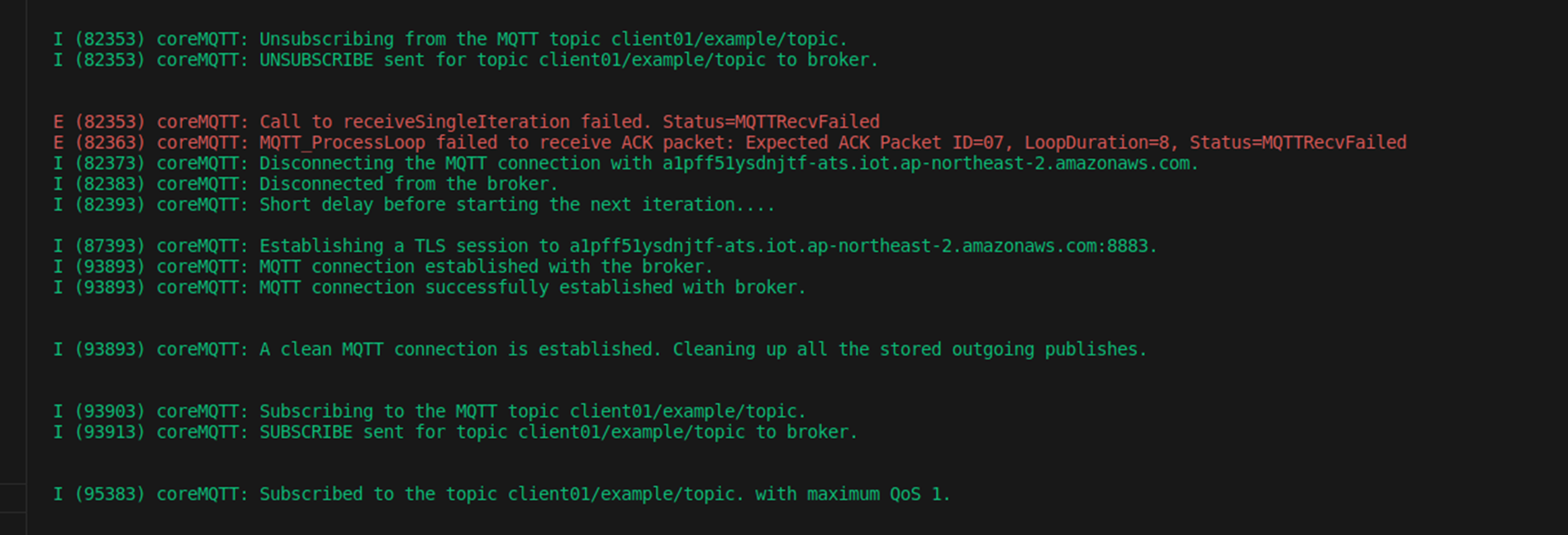E (127603) coreMQTT: Call to receiveSingleIteration failed. Status=MQTTRecvFailed