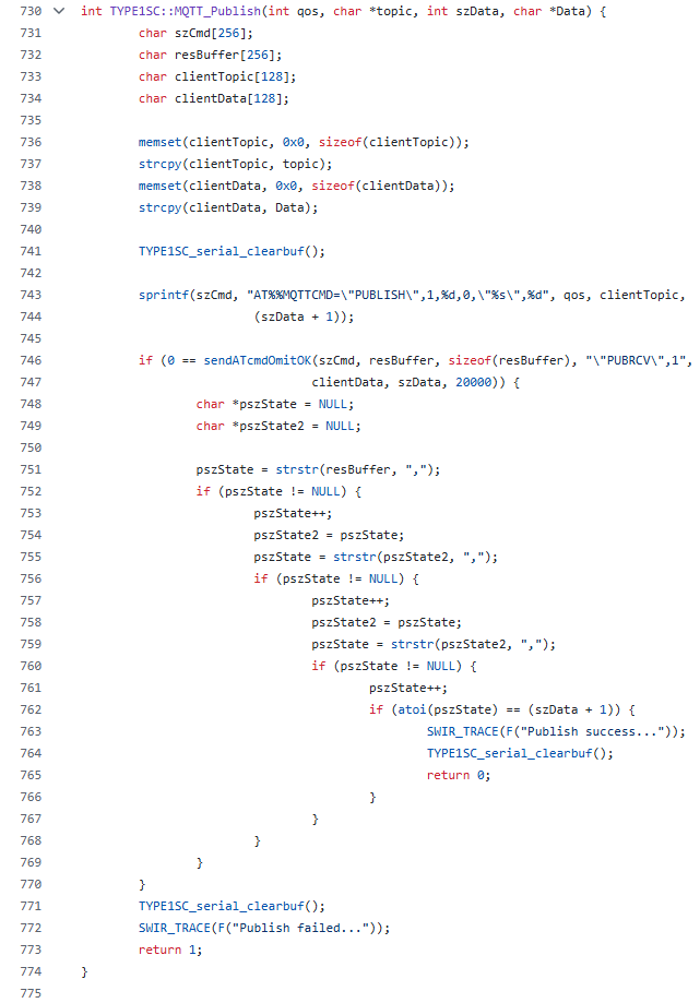 int MQTT_Publish(int qos, char *topic, int szData, char *Data);개발자가 직접 AT커맨드를 호출, 조합, 파싱해야 하는 불편함은 없지만,