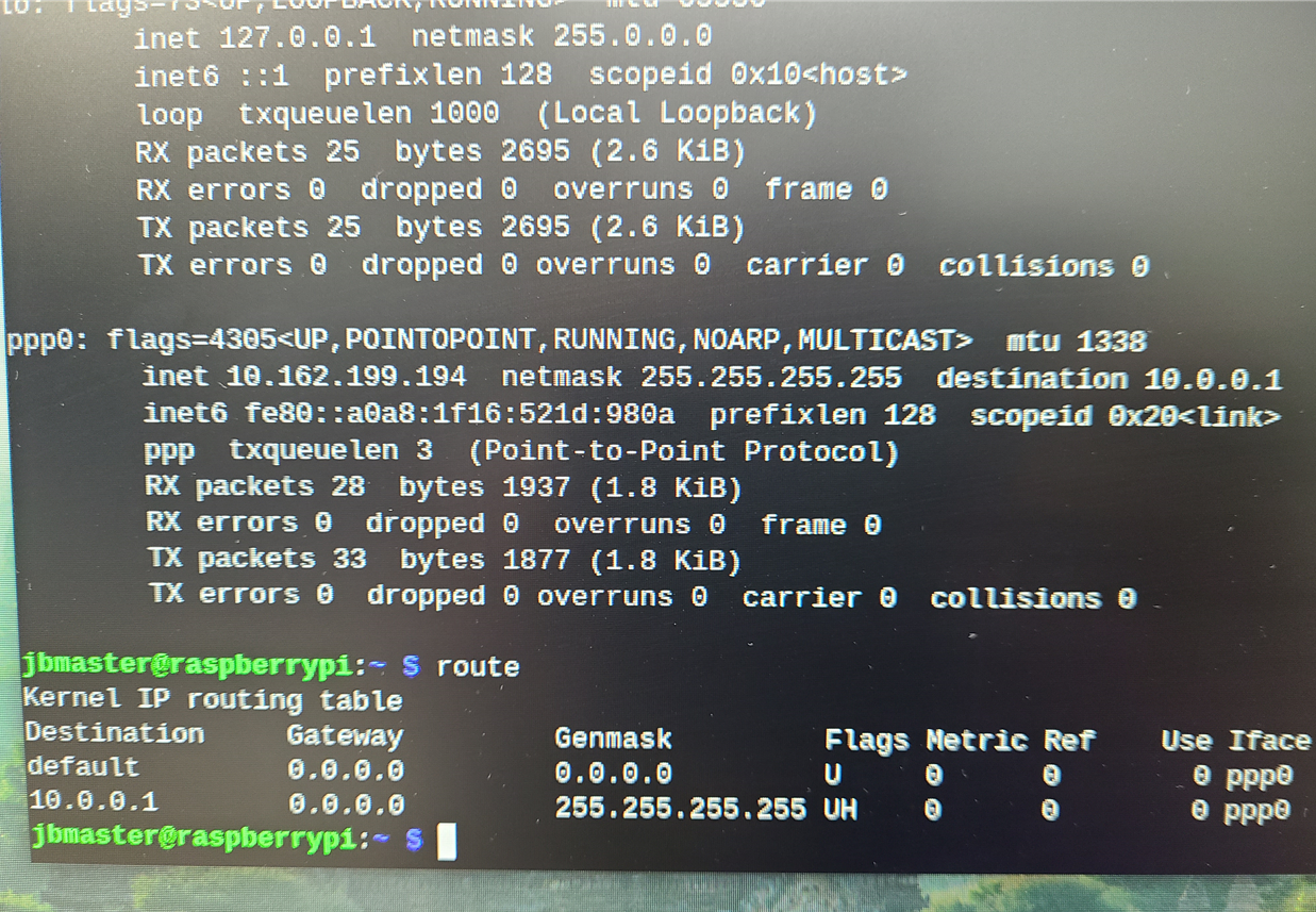 라즈베리파이5 와이파이 장치를 끈 상태에서 LTE모뎀을 PPP0 디바이스로 잡아서 아래와 같이 연결했고, PPP0로 외부 네트워크를 연결할 수 있도록 라우팅 테이블을 구성했습니다.