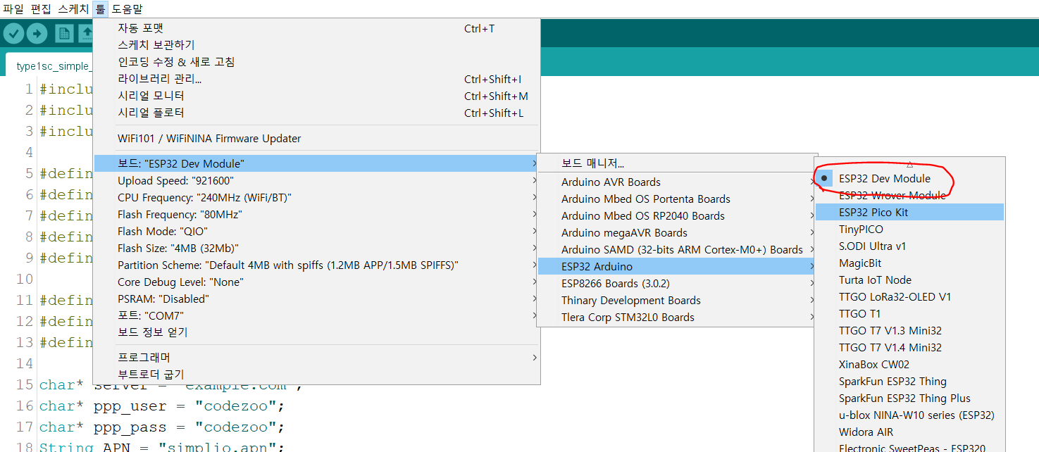 툴 -> 보드 -> ESP32 Arduino -> ESP32 Dev Module을 선택