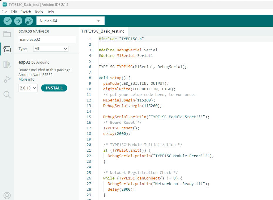 이제 LTE CATM1 내장형 모뎀을 동작시키기 위해 아래와 같이 TYPE1SC_Basic_test 예제를 불러옵니다.